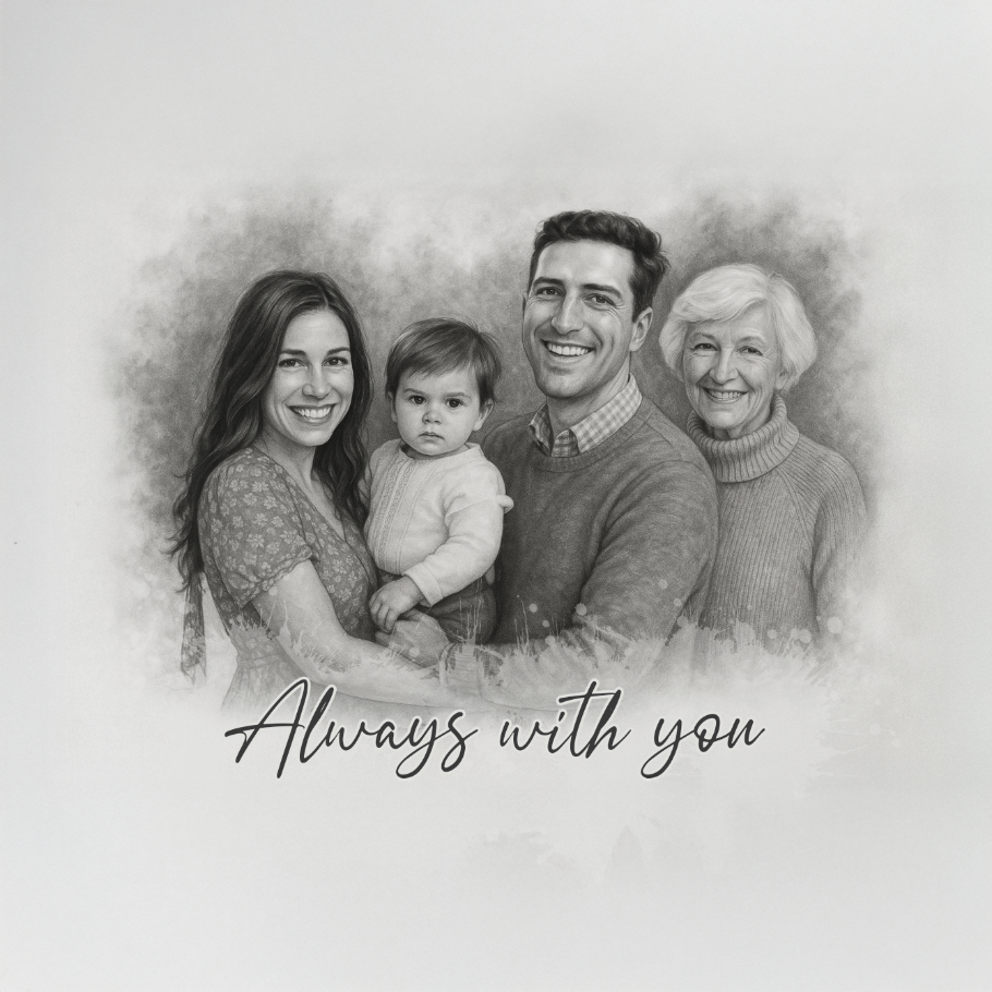 An “intimate yet inspiring” Pencil Drawing Portrait style that blends multiple photos into one timeless keepsake.